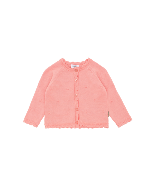 Cardigan aus weicher Baumwolle mit einem Lochmuster. Dieses Modell verfügt über ein welliges Rippbündchen am unteren Rand und wird vorne mithilfe von Knöpfen geschlossen. Dieses Produkt ist aus 100 % Bio-Baumwolle gefertigt.
