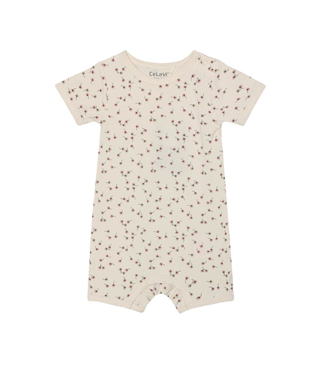 Strampler mit Allover-Print von CeLaVi in weicher Bambusqualität. Der Strampler hat kurze Ärmel und Beine. Lesen Sie mehr.