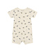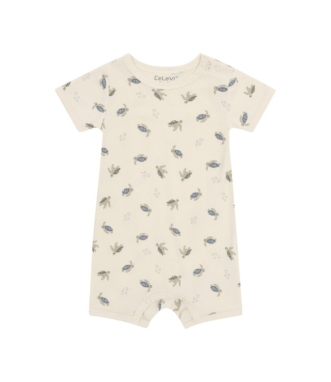 Strampler mit Allover-Print von CeLaVi in weicher Bambusqualität. Der Strampler hat kurze Ärmel und Beine. Das Material ist dehnbar. Er wird mit Druckknöpfen an der Schulter und zwischen den Beinen geschlossen. Zertifiziert durch OEKO-TEX® STANDARD 100 Cert. No. 2276-364 DTI