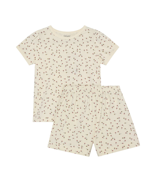 Sommer-Schlafanzug-Set aus Bambus von CeLaVi. Das Set hat eine lockere Passform. Es besteht aus einem kurzärmeligen T-Shirt und Shorts, beide mit Allover-Print. Die Shorts haben einen elastischen Bund. Zertifiziert durch OEKO-TEX® STANDARD 100 Cert. No. 2276-364 DTI