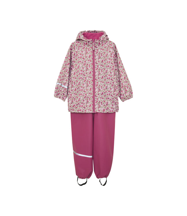 Recycelte Regenbekleidung mit Jacke und Hose. Die Regenjacke hat einen Allover-Druck und eine abnehmbare Kapuze mit Druckknöpfen. Die Jacke ist an den Handgelenken und am Saum elastisch und lässt sich mit einem Reißverschluss und Druckknöpfen leicht schließen. Die Kapuze hat einen Gummizug im Gesicht, damit sie eng am Kopf anliegt. Die Regenhosen sind bis Größe 100 mit verstellbaren CeLaVi-Gurten und ab Größe 110 mit elastischem Bund erhältlich. Die Regenhose hat elastische Stiefelriemen. Das Set hat reflektierende Prints an den Ärmeln und Beinen. Der Regenmantel hat eine Wasserdichte von 10.000 mm mit verschweißten Nähten und ist absolut wasserdicht.
