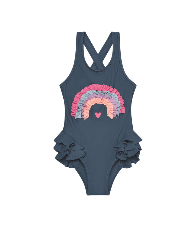 Hübscher Badeanzug mit breiten Trägern, die sich auf dem Rücken kreuzen. Weitere Lagen mit Rüschen an den Beinen und Druck auf der Vorderseite. Der Rest ist einfarbiger Stoff mit viel Stretch.