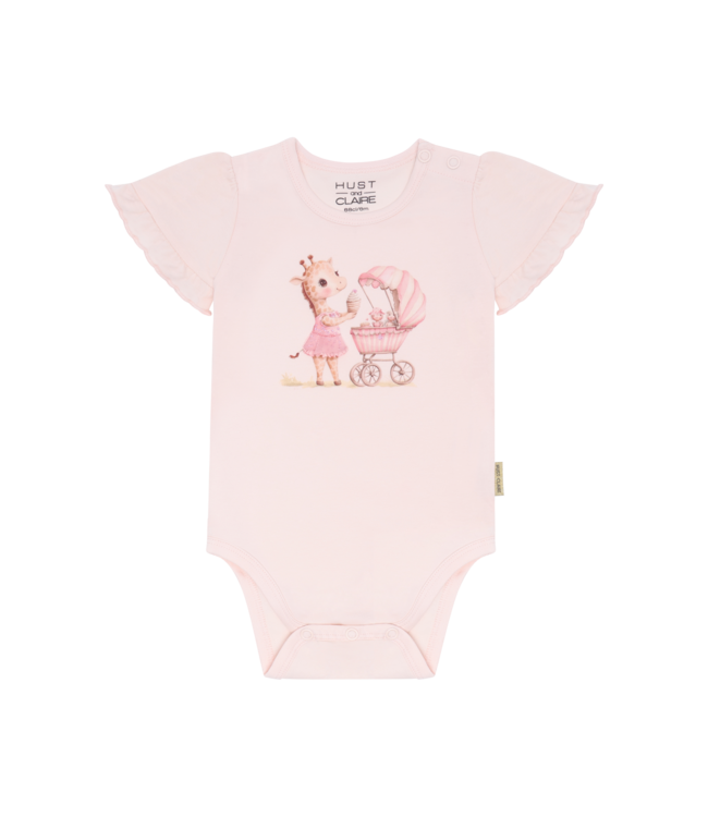 Body aus dehnbarer Baumwolle. Dieses Modell ist vorne mit einem Giraffenmotiv versehen und auf der rechten Schulter und zwischen den Beinen mit Knopfverschlüssen.