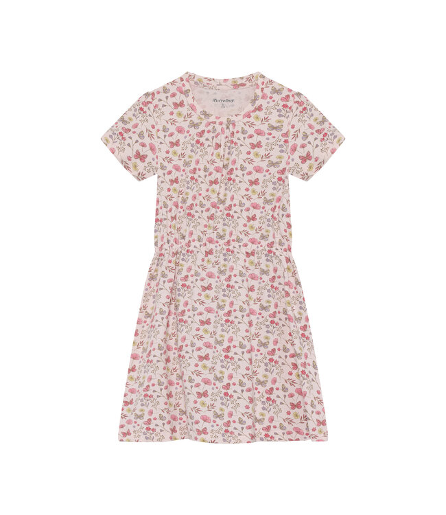 Kurzärmeliges Kleid von Minymo. Das Kleid ist mit einem Allover-Print versehen. Die Ärmel haben einen leichten Puffeffekt.