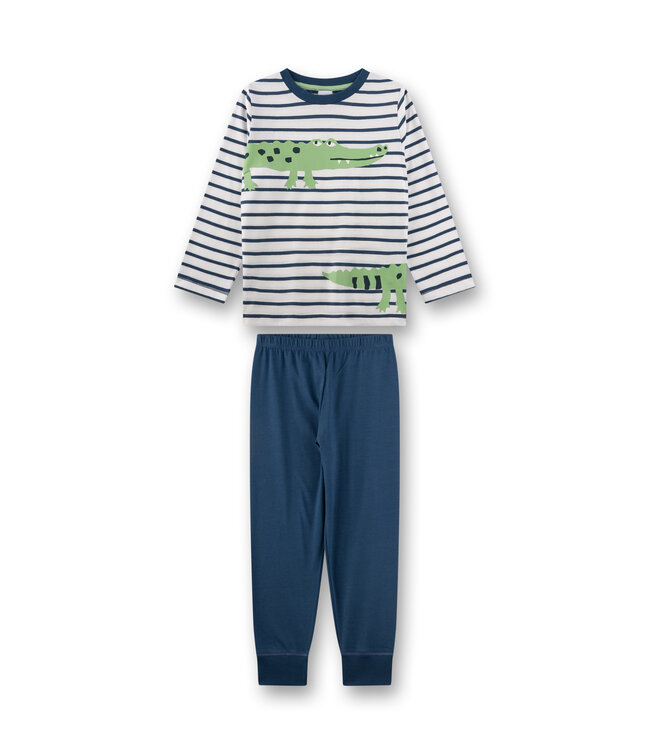 Der lange Jungen-Schlafanzug von Sanetta überzeugt mit einem fröhlichen Design und hohem Tragekomfort. Das Langarmshirt im modischen Ringel-Look in Jeansblau und Weiß wird durch einen witzigen Krokodil-Print zum echten Hingucker. Dazu passt die einfarbig blaue Schlafhose mit elastischem Bund und weichen Rippbündchen an den Beinabschlüssen, die für optimale Bewegungsfreiheit sorgen. Ein funktionaler und bequemer Sitz ist durch die hochwertige Verarbeitung des Jungen-Schlafanzugs garantiert. Gefertigt aus luftigem Single-Jersey aus 100 % Baumwolle ist der Schlafanzug für Jungs besonders hautfreundlich, flexibel und ideal für erholsame Nächte.