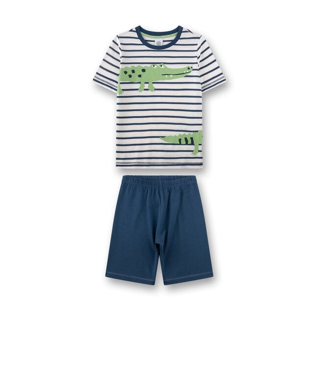 Der kurze Schlafanzug von Sanetta für Jungen bringt fröhliche Farben und Komfort in die Nacht! In einem satten Jeansblau mit einem verspielten Alloverprint aus grünen Krokodilen, ist dieser Schlafanzug ein echter Hingucker. Der elastische Bund an der Schlafshorts sorgt für ein angenehmes Tragegefühl und optimale Bewegungsfreiheit. Dank der Ökotex Standard 100 Zertifizierung ist er sanft zur empfindlichen Kinderhaut. Der kurze Schnitt eignet sich ideal für warme Nächte und der coole Koro-Print lässt jedes Jungenherz höher schlagen.