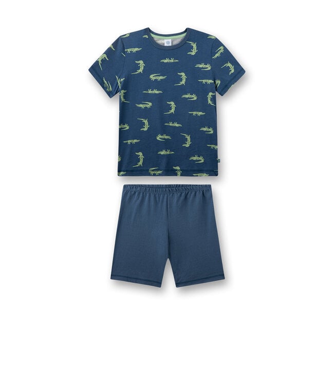 Der kurze Jungen-Schlafanzug von Sanetta ist das perfekte Nachtoutfit für kleine Abenteurer. Mit seinem lustigen, geringelten Schlaf T-Shirt in Jeansblau und Weiß und dem witzigen Krokodil-Print wird jedes Zu-Bett-Gehen zum aufregenden Erlebnis. Hergestellt aus 100% Baumwolle in Single Jersey-Qualität, bietet dieser Schlafanzug ein besonders sanftes Tragegefühl, das die empfindliche Kinderhaut schont. Das elastische Bündchen am Hals sorgt für optimale Bewegungsfreiheit, während der flexible Bund der Hose einen perfekten Sitz garantiert. Ideal für lange Nächte voller Träume und süßer Abenteuer.