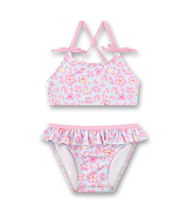 Bereite deiner Kleinen unvergessliche Sommertage im modischen Mädchen-Bikini von Sanetta! Der pastellige Leo-Print in rosa, hellblau, gelb und pink sorgt für einen fröhlichen Look, während die Spagettiträger am Oberteil, die am Rücken über Kreuz zusammenlaufen, als Highlight fungieren. Die schicke Bikinihose ist mit einer süßen Rüsche am Saum verziert und macht den Look komplett. Hergestellt aus schnelltrocknendem Materialmix aus 84% recyceltem Polyester und 16% Elasthan, bietet dieser Bikini zudem UV-Schutz 50+, damit deine kleine Wasserratte sicher und stylisch planschen kann.