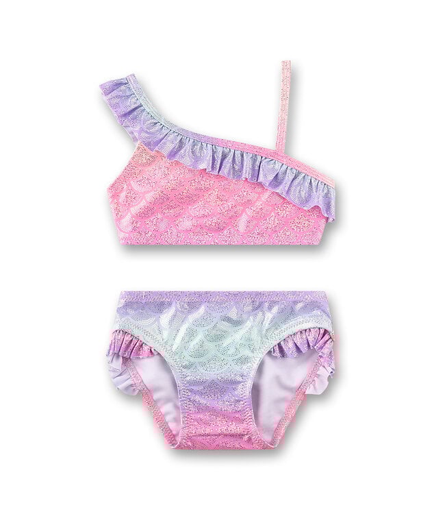 Verleihe deinem Sommerlook mit dem zauberhaften Mädchen-Bikini von Sanetta einen glitzernden Akzent! Der regenbogenfarbene Bikini mit glitzernden Fischschuppen kombiniert mit asymmetrischen Trägern macht diesen Badeanzug zu einem echten Hingucker. Der asymmetrische Ausschnitt mit schräg verlaufender Rüsche sorgt für einen modischen Twist, während die schönen Rosa- und Blautöne durch die silberne Glitzerfolie zum Strahlen gebracht werden. Meerjungfrauen-Fans kommen it diesem wundervollen Mädchen-Badeanzug voll auf ihre Kosten. Mit UV-Schutz 50+ bietet der Meerjungfrauen-Badeanzug optimalen Schutz.