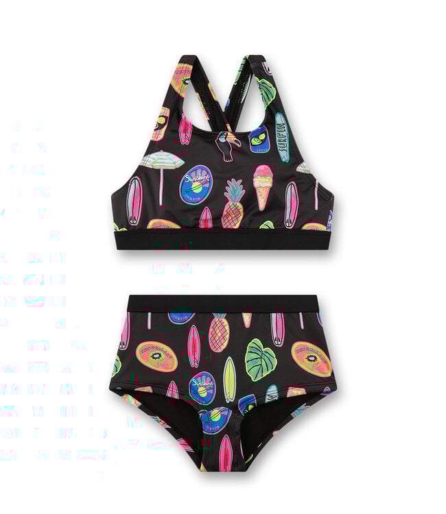 Entdecke den perfekten Sommerlook mit dem stilvollen Bikini für Mädchen ab Größe 128 von Sanetta! Dieser Mädchen-Bikini besticht durch ein auffälliges und buntes Allover-Design auf der Bikinihose und dem Oberteil mit coolen Sommer-Motiven aus Obst, Surfbrettern, Blättern, Eis und Tukane auf einem schwarzen Hintergrund. Die gekreuzten Träger am Rücken sorgen nicht nur für einen modischen Touch, sondern auch für einen optimalen Halt. Hergestellt aus einem hochwertigen Materialmix aus 82% Polyamid und 18% Elasthan, ist dieser Bikini sowohl elastisch als auch schnelltrocknend – ideal für unbeschwerte Tage am Strand oder im Schwimmbad. Ab Größe 140 erwarten Dich herausnehmbare Pads im Oberteil, während die hipsterförmige Pant und das Oberteil gefüttert sind. Mit zuverlässigem UV-Schutz von 50+ schützt dieser Bikini nicht nur die Haut, sondern bietet auch ein angenehmes Tragegefühl!