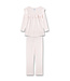 Dieser hellrosa, lange Mädchen-Schlafanzug von Sanetta begeistert mit einem hochwertigen Ajour-Muster, das durch kleine, regelmäßige Rauten in dunklem Rosa ergänzt wird. Das Schlaf-Oberteil mit langen Ärmeln ist mädchenhaft gestaltet: Gerüschte Schultern, zarte Rüschen und ein Abnäher auf Brusthöhe lassen es in eleganten Falten nach unten fallen. Die bequeme Schlafhose verfügt über einen elastischen Taillenbund und sorgt so für eine optimale Passform. Ein wunderschöner Schlafanzug für kleine Prinzessinnen, der süße Träume verspricht.