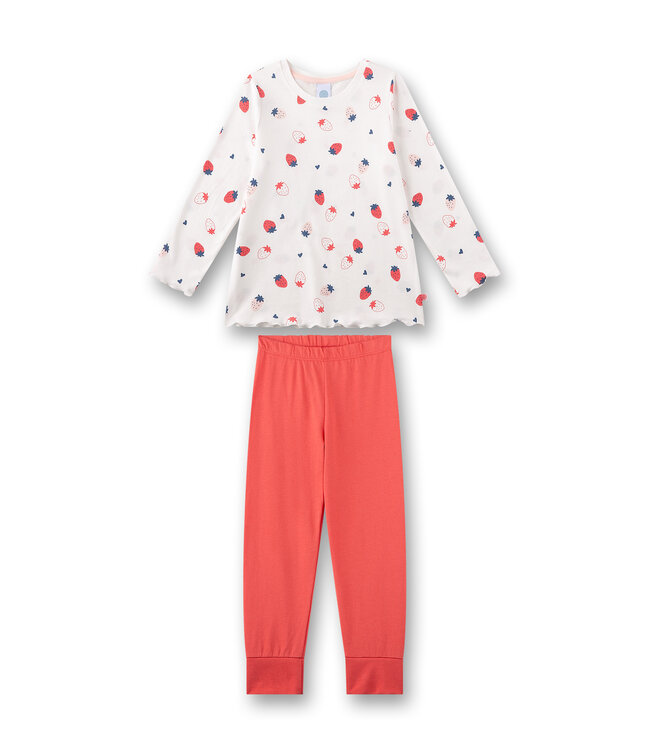 Dieser traumhafte Schlafanzug für Mädchen besteht aus 100 % weicher, hautfreundlicher Baumwolle und sorgt für süße Träume und höchsten Tragekomfort. Das langärmlige Oberteil zeigt sich in strahlendem Weiß mit einem fröhlichen Allover-Print aus roten und rosafarbenen Erdbeeren, ein fruchtig-verspielter Look, der gute Laune macht. Das Oberteil ist gerade geschnitten, hat einen klassischen Rundhalsausschnitt und wellige Abschlüsse an Ärmeln und Saum, die den mädchenhaften Stil perfekt unterstreichen. Die lange Hose greift den Farbton der rosafarbenen Erdbeeren auf und rundet das Outfit harmonisch ab. Dank elastischem Bund sitzt sie bequem und bietet viel Bewegungsfreiheit.