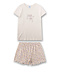 Dieses sommerliche Schlafanzug-Set für Mädchen verbindet Komfort, Leichtigkeit und verspieltes Design. Das kurzärmelige Oberteil ist in hellem Cremeton gehalten und zart mit einem linearen Blumenmotiv auf der Vorderseite verziert. Die leicht gewellten Abschlüsse an den Ärmeln verleihen dem Shirt einen charmanten, mädchenhaften Akzent.