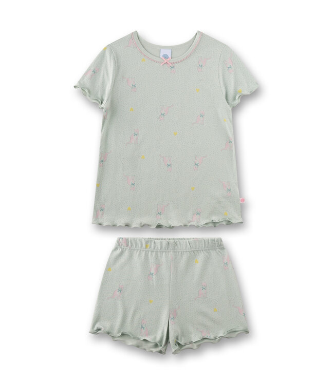 Mach die Nächte deiner kleinen Prinzessin zu einem besonderen Erlebnis mit dem kurzen Schlafanzug von Sanetta! Der witzige Katzenallover mit grafischem Muster und zarten Herzen in sanftem Grün sorgt für einen fröhlichen Look. Das Oberteil besticht durch ein kontrastfarbiges Häkelbörtchen am Halsausschnitt, eine süße Satinschleife in Rosa und kurze Ärmel mit welligem Rollsaum. Die dazugehörigen Shorts im klassischen Schnitt runden den mädchenhaften Style ab. Aus 50% Baumwolle und 50% Modal gefertigt, ist der Schlafanzug besonders weich und angenehm auf der Haut. Entdecke auch die passende Unterwäsche in unserem Online-Shop!