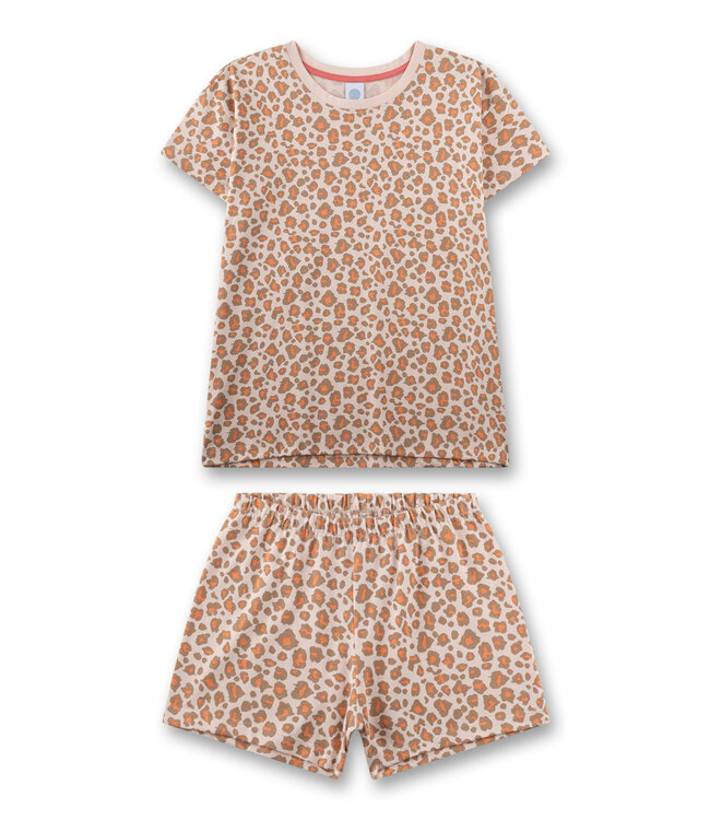 Der kurze Mädchen-Schlafanzug von Sanetta bringt einen Hauch von Abenteuer in die Nacht! Mit seinem trendigen Leo-Alloverdruck auf softem Rosé Beige und den harmonischen Leo Spots in dunklerem Beige und Apricot ist dieses Set ein Must-Have für kleine Modebewusste. Das Oberteil und die Shorts überzeugen durch einen Rundhalsausschnitt mit farblich abgesetztem Nackenband und einem elastischen Taillenbund für bequemen Tragekomfort. Hergestellt aus angenehmen Single-Jersey aus 100% Baumwolle, bietet dieser kurze Mädchen-Schlafanzug nicht nur Style, sondern auch höchste Qualität und Sicherheit für Ihre Kleinen.